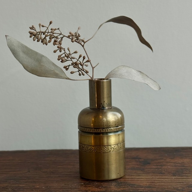真鍮製の小型フラワーベースです。 円筒形の本体に、胴部分の装飾ラインが特徴的なデザイン。シンプルながら程よい装飾性があり、モダン・インダストリアル系のインテリアにも合わせやすい一点です。 底面に刻印が入っています。詳細な製造背景は不明ですが、しっかりとした重量感があり、真鍮ならではの質感が楽しめます。 一輪挿しとして小さな花や枝物を飾るのにちょうど良いサイズ感。生花はもちろん、ドライフラワーやスワッグのベースとしても使いやすい形状です。 商品サイズ 高さ:約8.5cm 直径:約4cm 口径:約1.2cm 配送サイズ 60サイズ