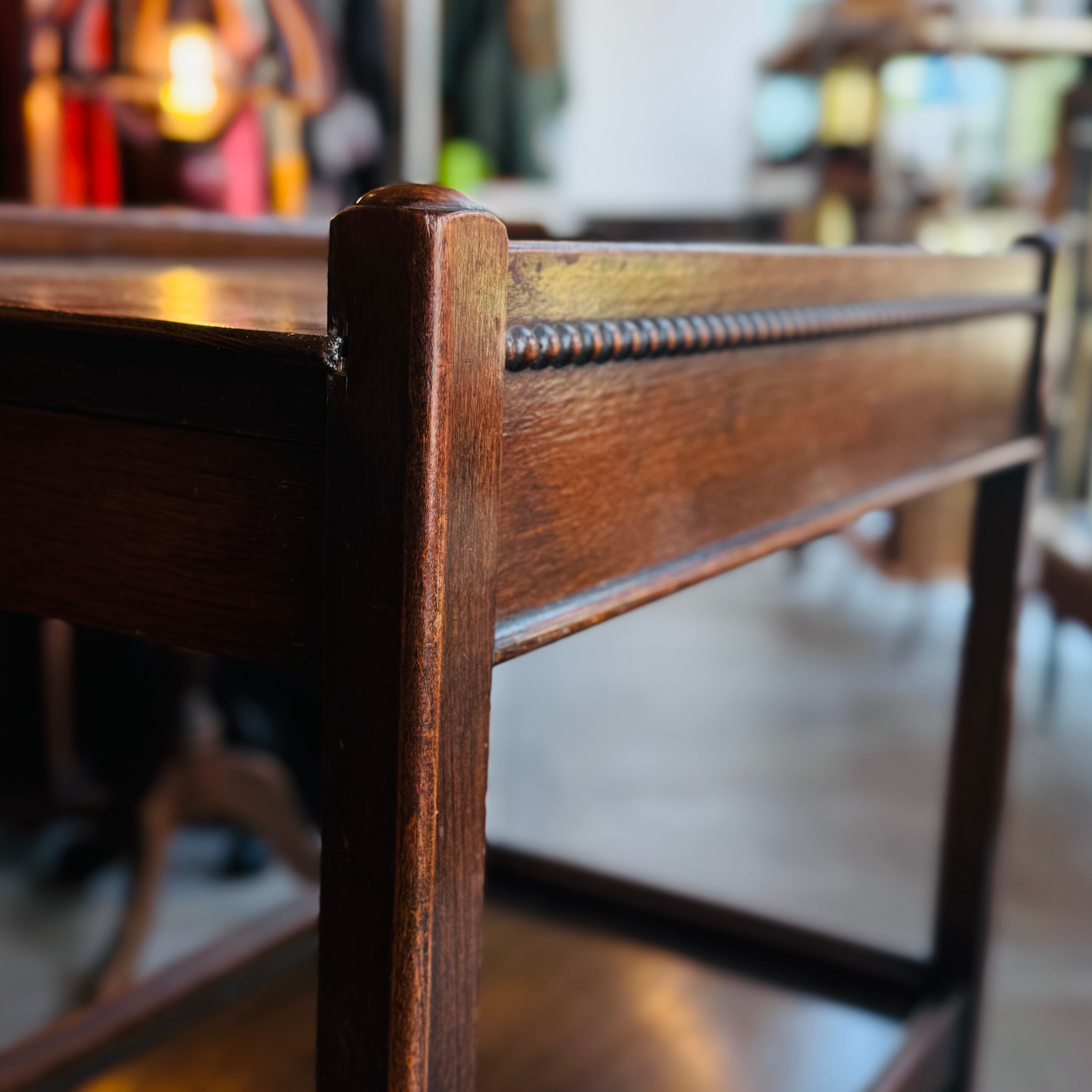 こちらは20世紀前半、ヨーロッパで製造されたと見られるアンティークのキャスターワゴン。無垢のオーク材を用いた堅牢なつくりに、側面の真鍮鋲がクラシカルな装いを添えています。引き出しの内側には、グリーンフェルトが貼られており、細部にまで気配りが感じられる一品です。