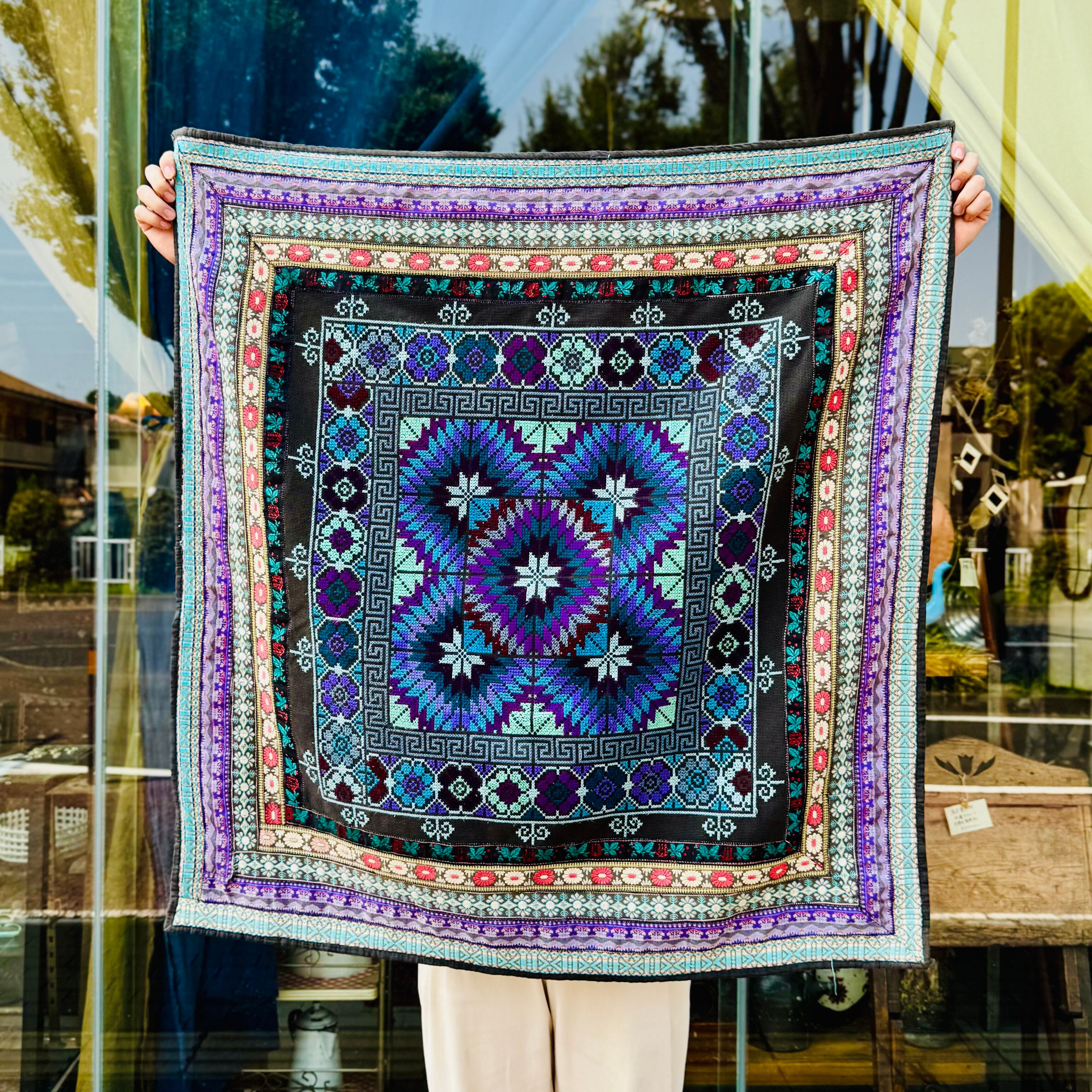 鮮やかな幾何学模様と花文様が目を惹く、エスニックテイストのマルチカバーです。