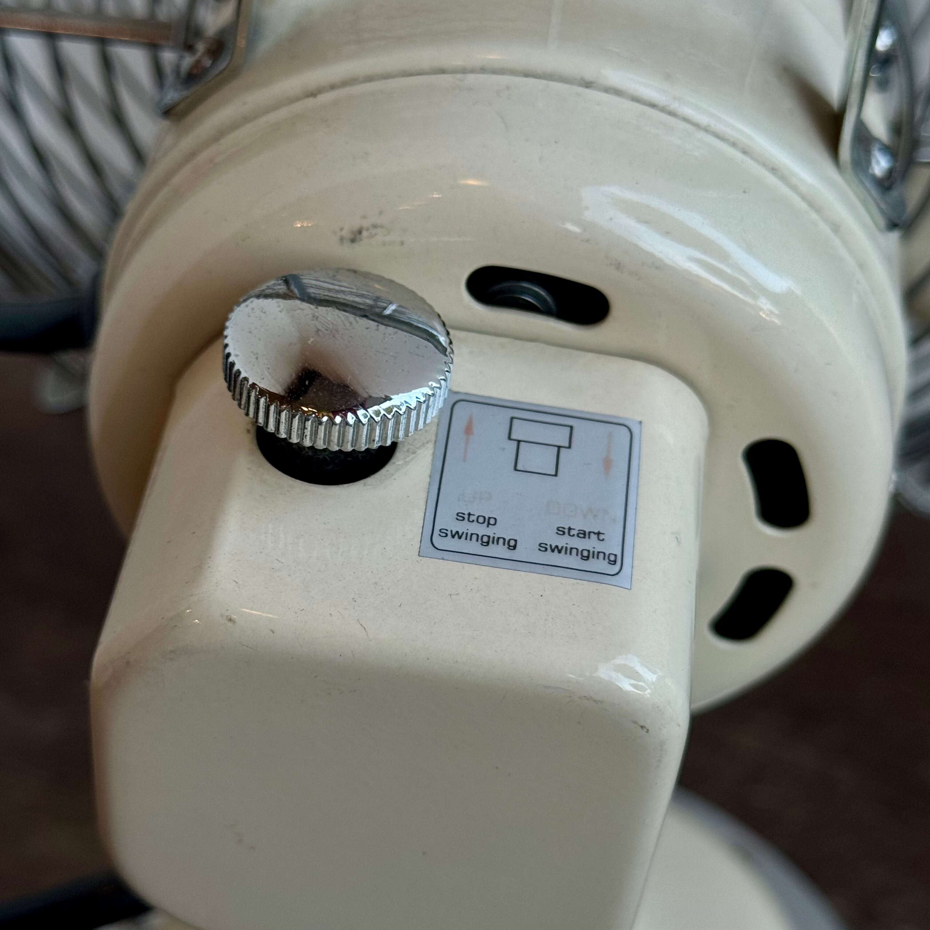 クラシカルな金属ガードと、温かみのあるアイボリーカラーが調和した、インダストリアルな卓上扇風機「Fraîcheur」。