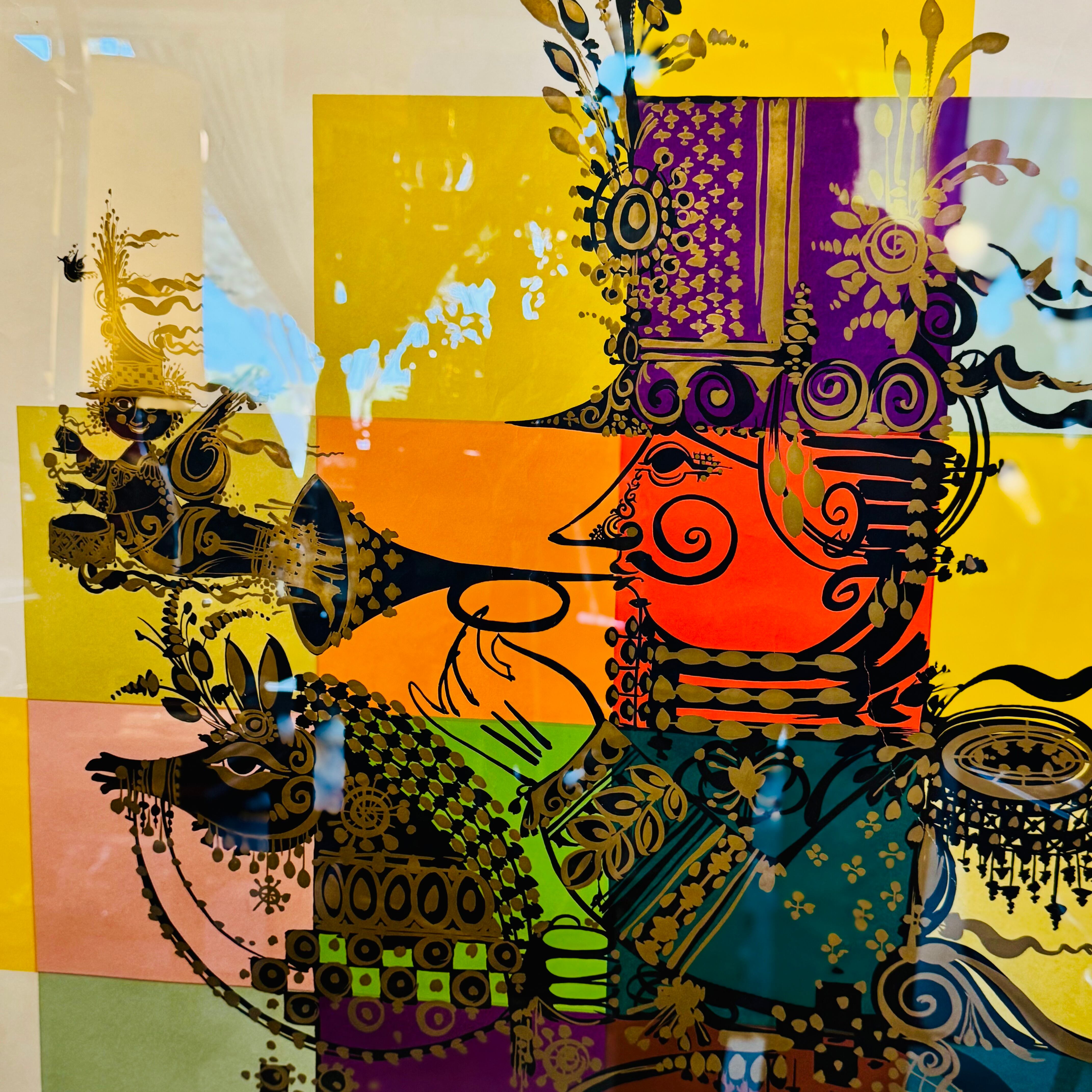 鮮やかな黄色・オレンジ・緑・紫のカラーブロックを背景に、楽器を奏でる人物と動物が、黒と金の細密な文様で描かれています。金インクが光を受けて浮かび上がることで、舞台の熱気や祝祭的な空気感をそのまま再現しているかのようです。