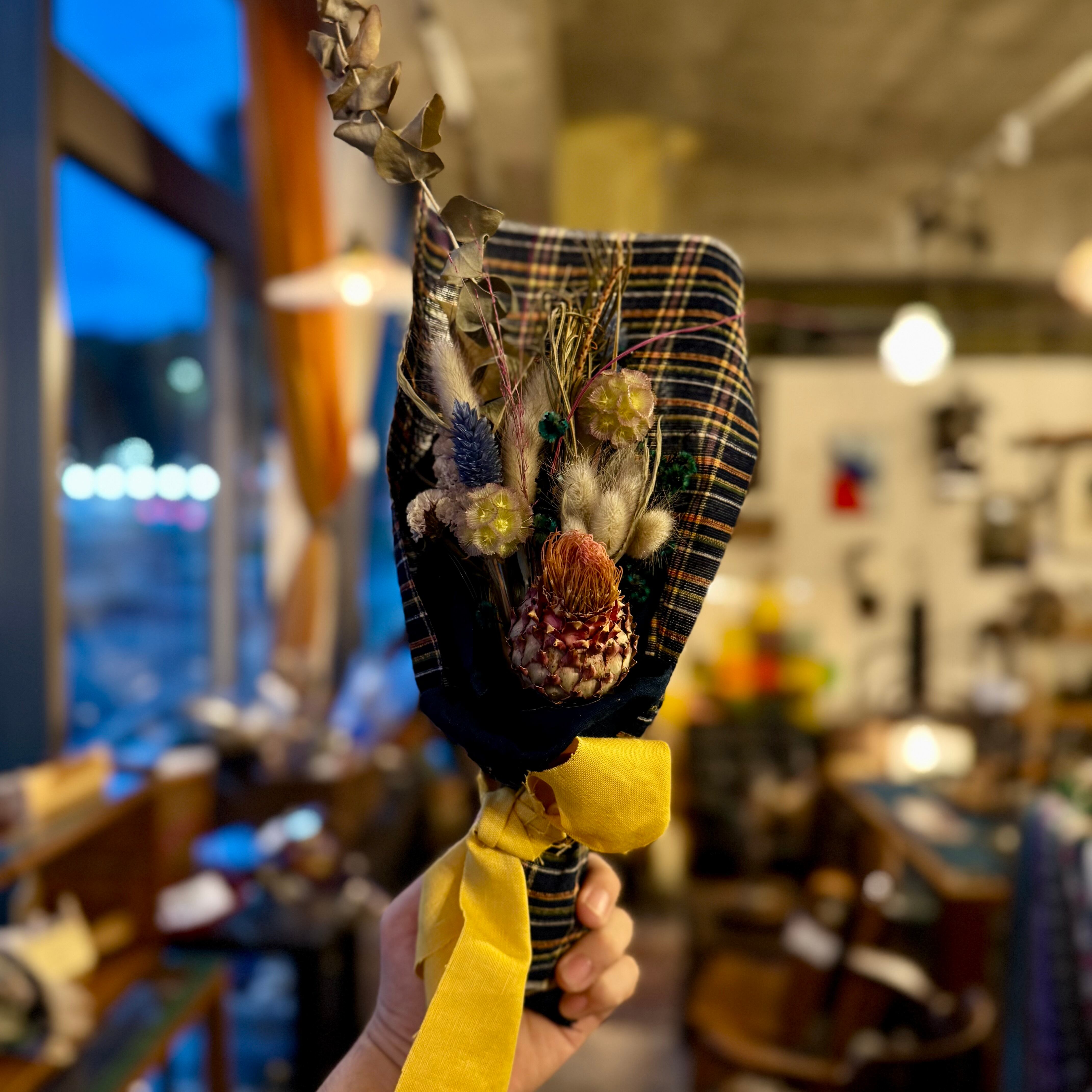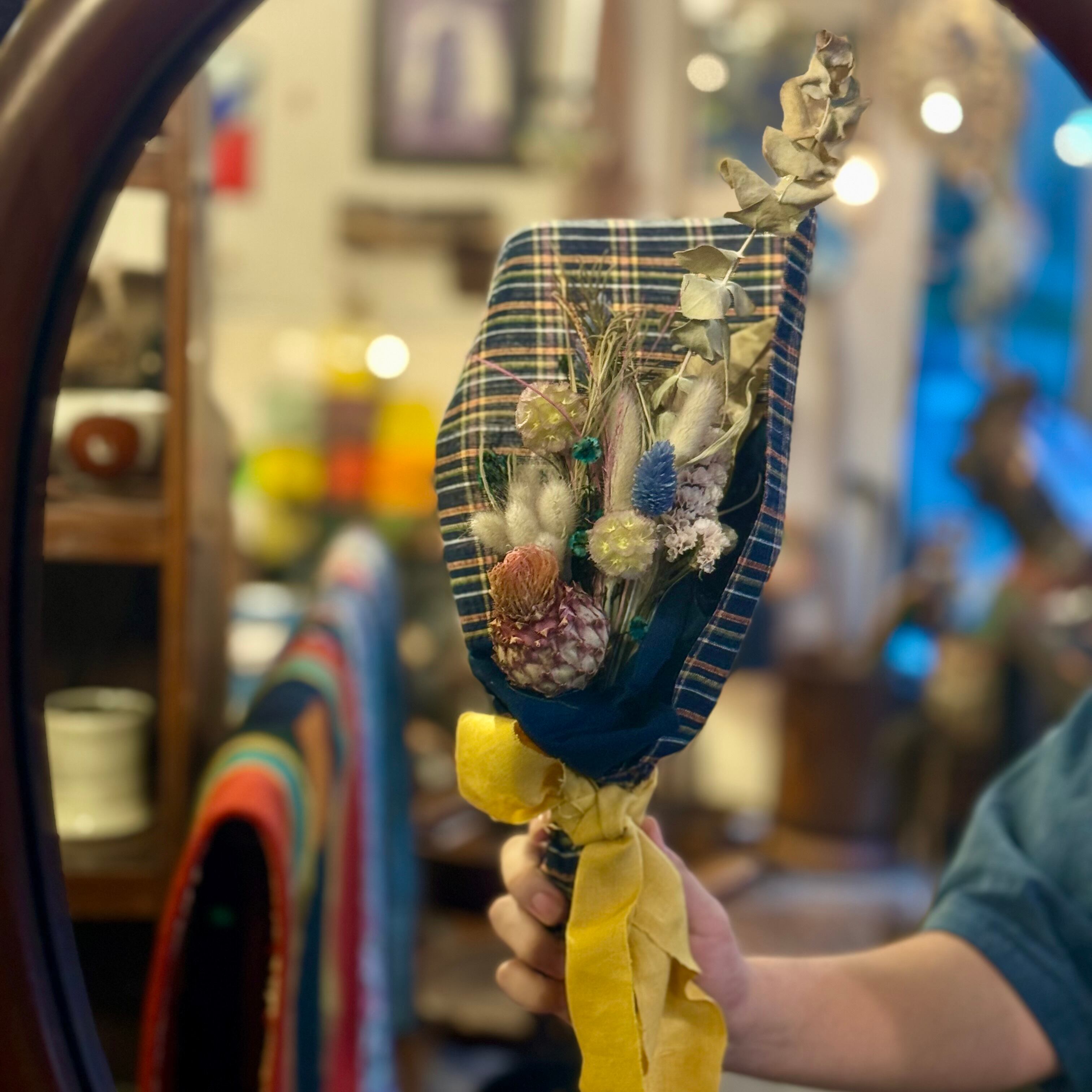 色とりどりのドライフラワーを、小さなヴィンテージ布に包み込んだ「イロイロミニブーケ」