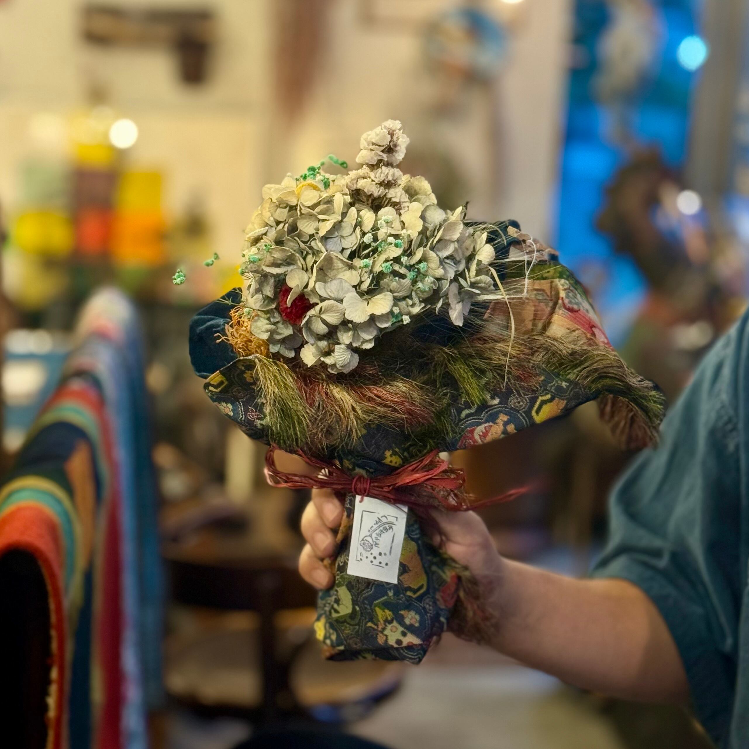 色とりどりのドライフラワーを、小さなヴィンテージ布に包み込んだ「イロイロミニブーケ」
