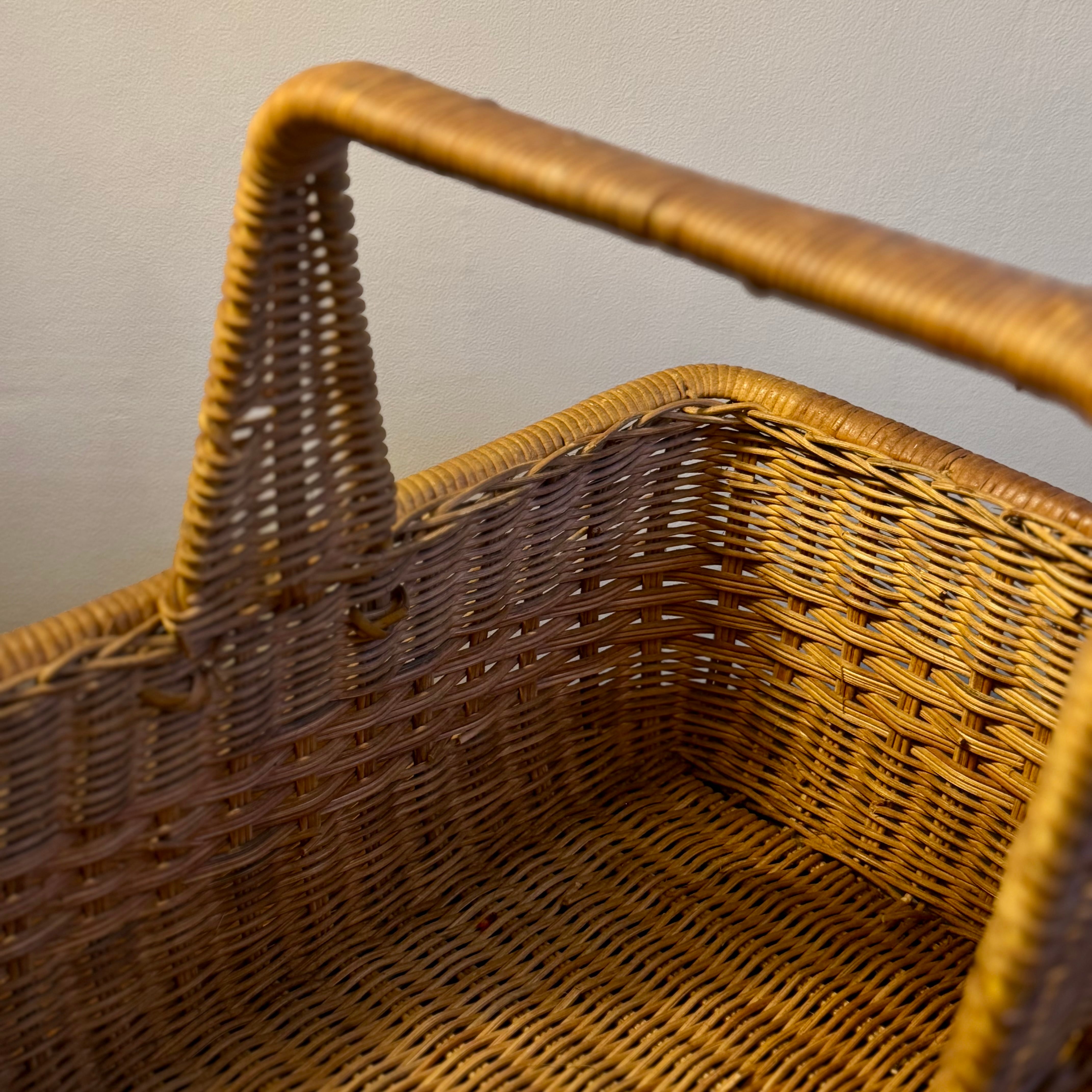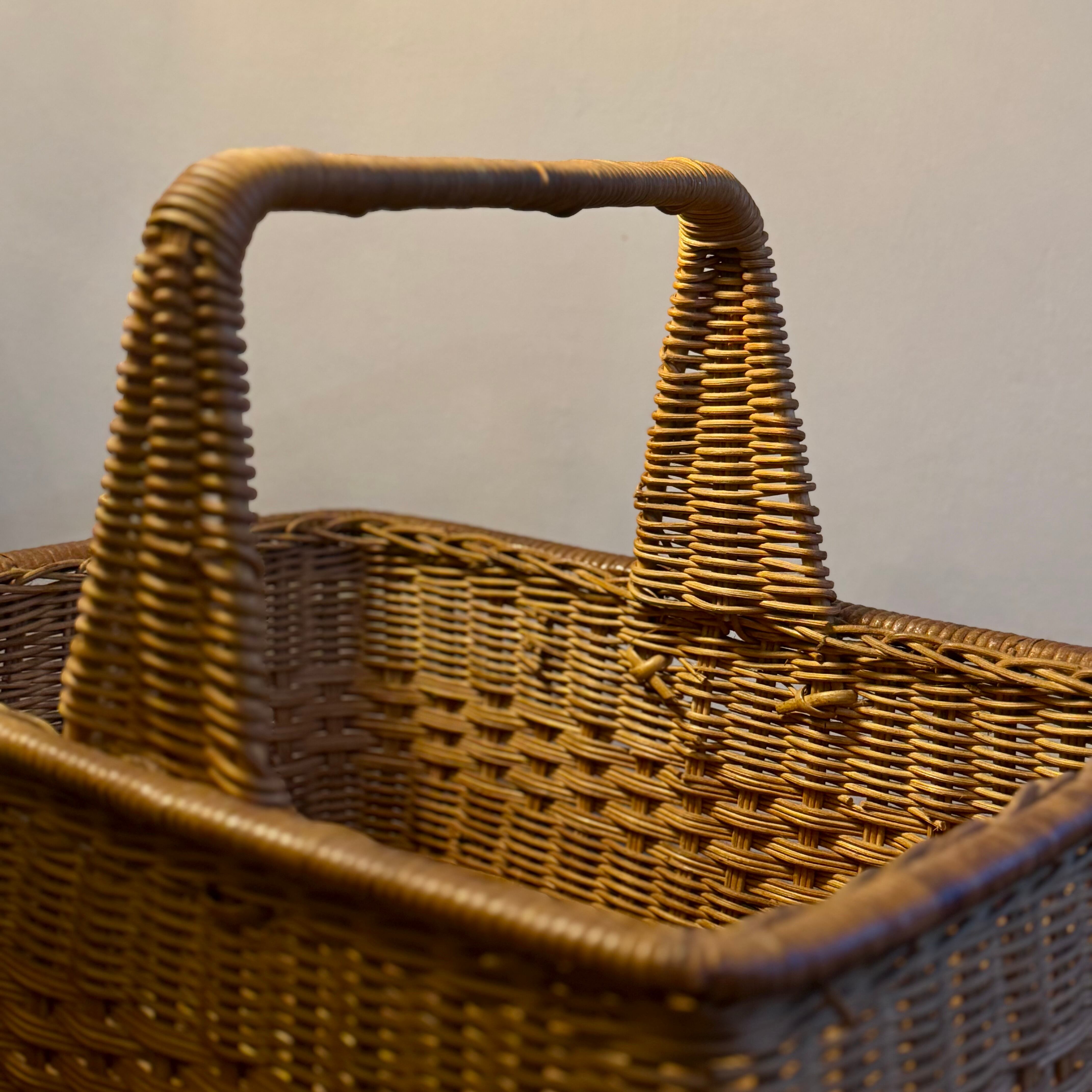 格子状の編み目、太い縁巻き、台形に立ち上がる持ち手——