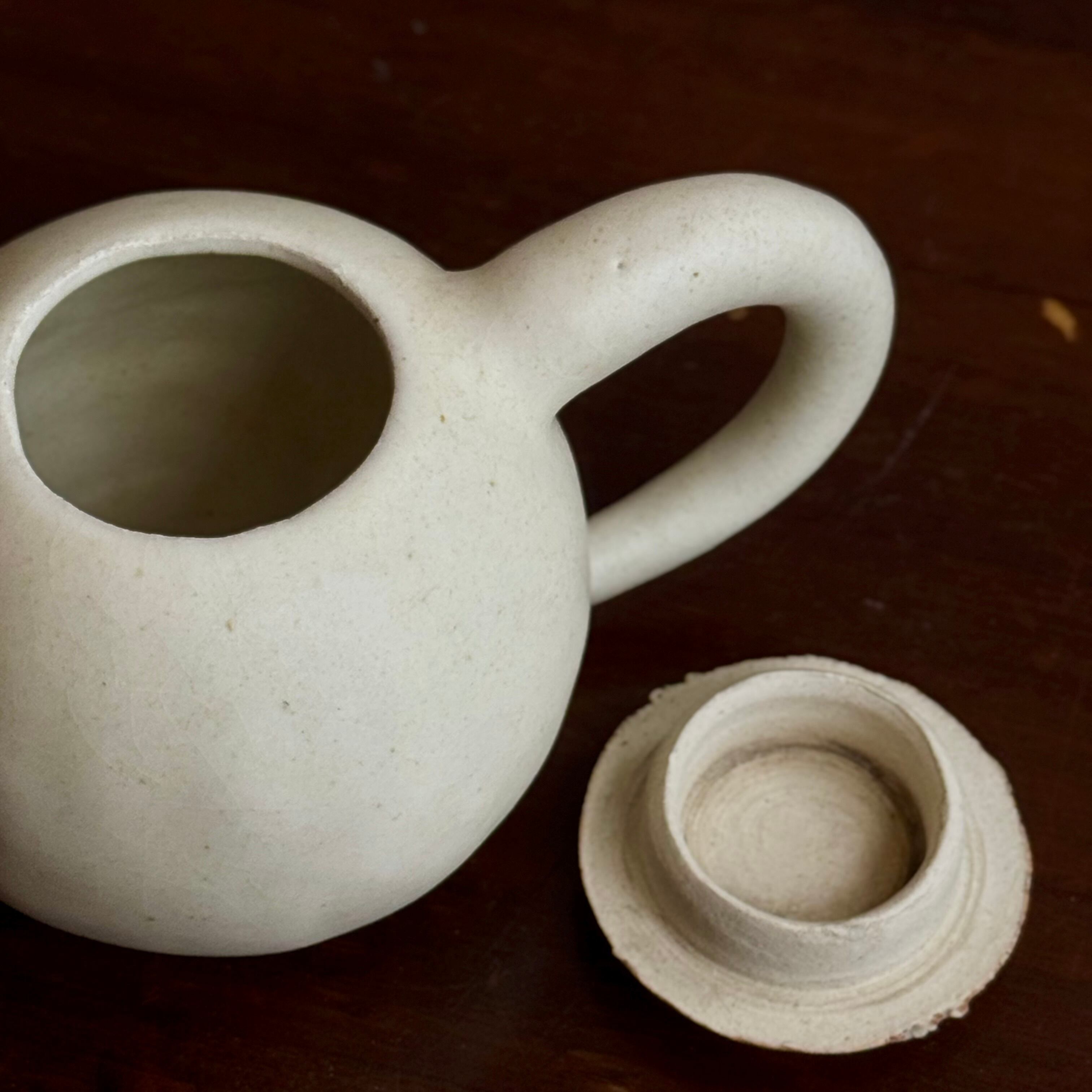 まるいフォルムにすっと伸びる注ぎ口。余計な装飾はなく、ただ白い土肌だけがそこにあります。