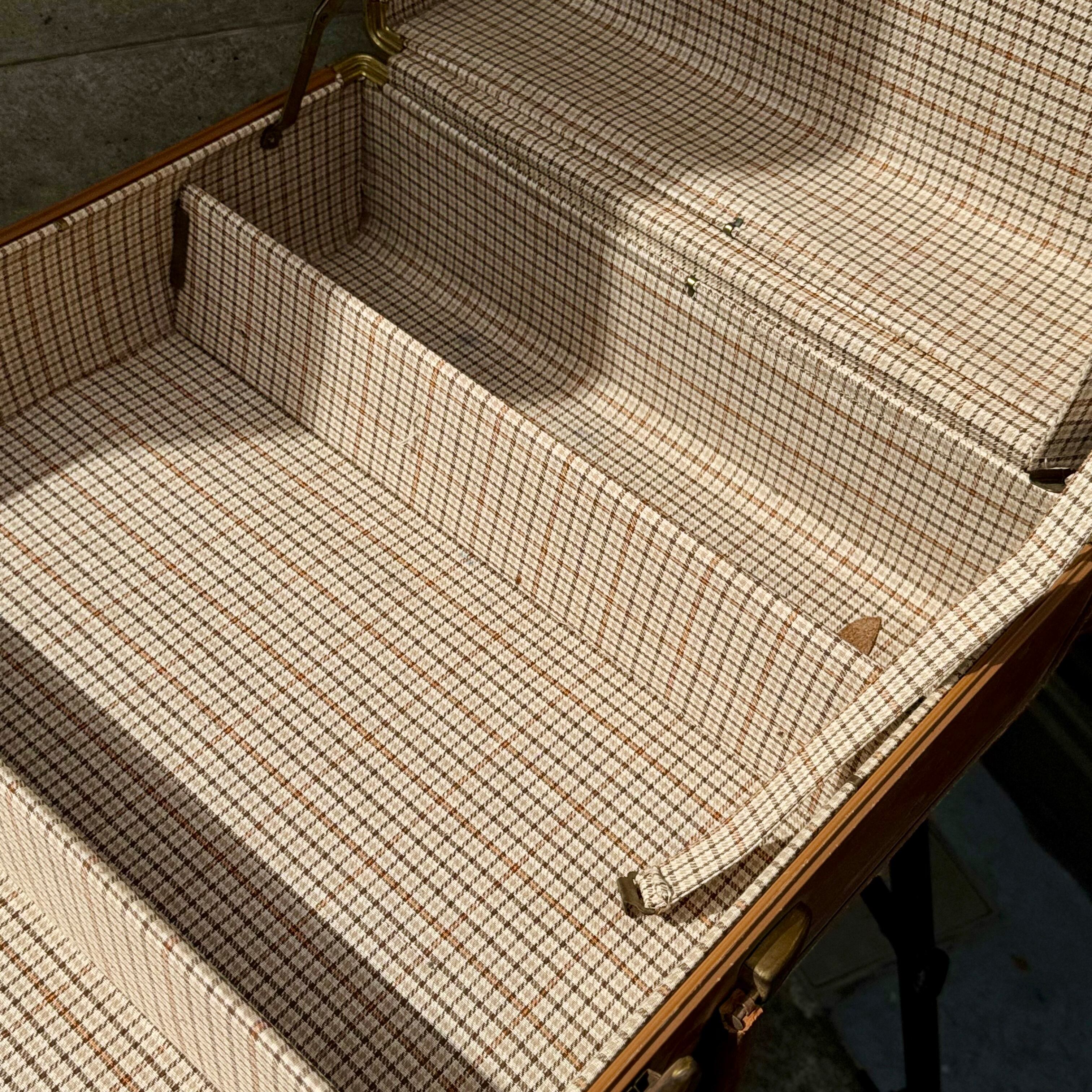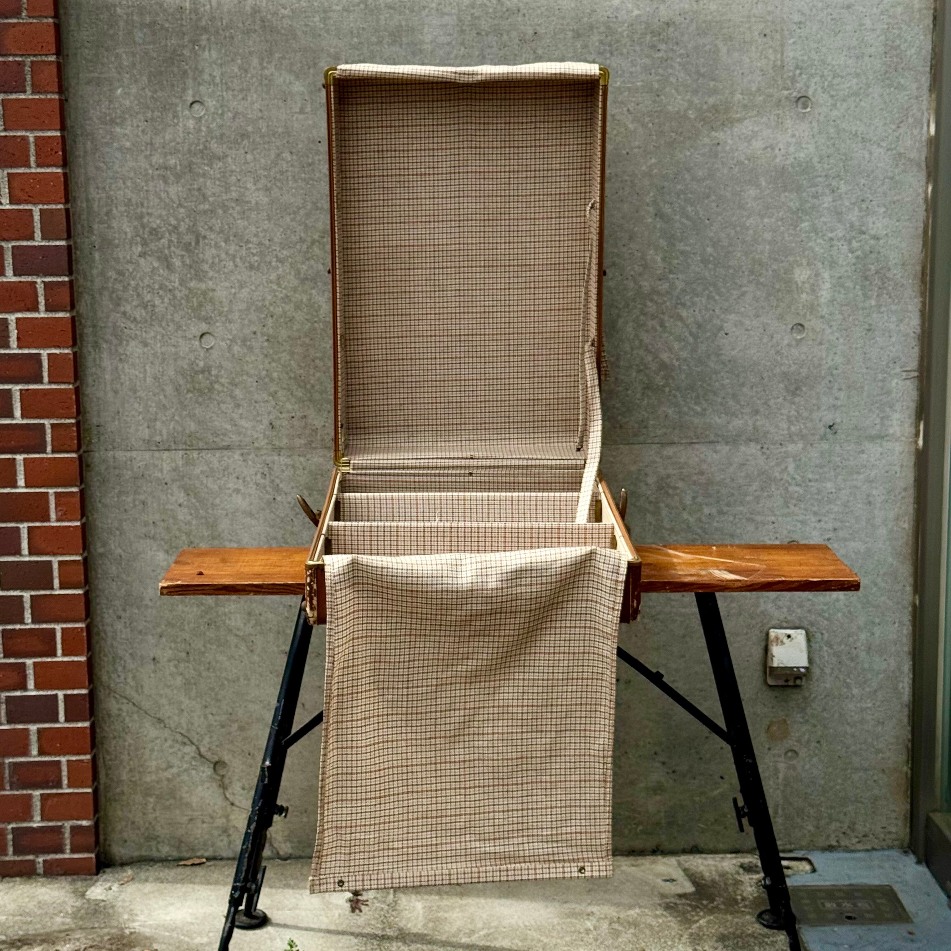 本品は縦に開閉する「トランク型」で、内部にはチェック柄の布張りと仕切り板を備えています。旅支度を整える動作そのものが儀式のように感じられる一品。
