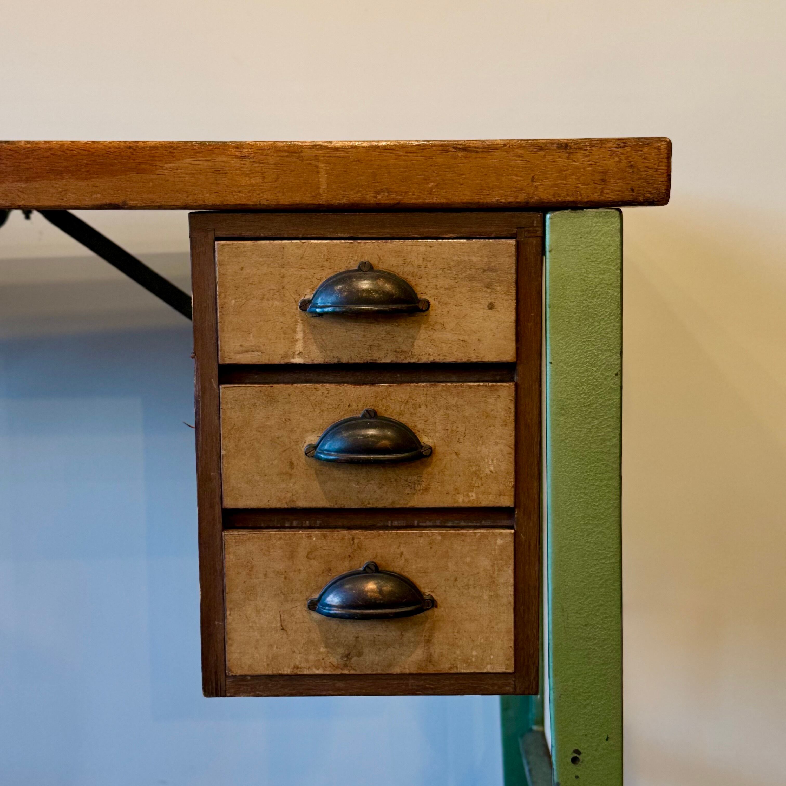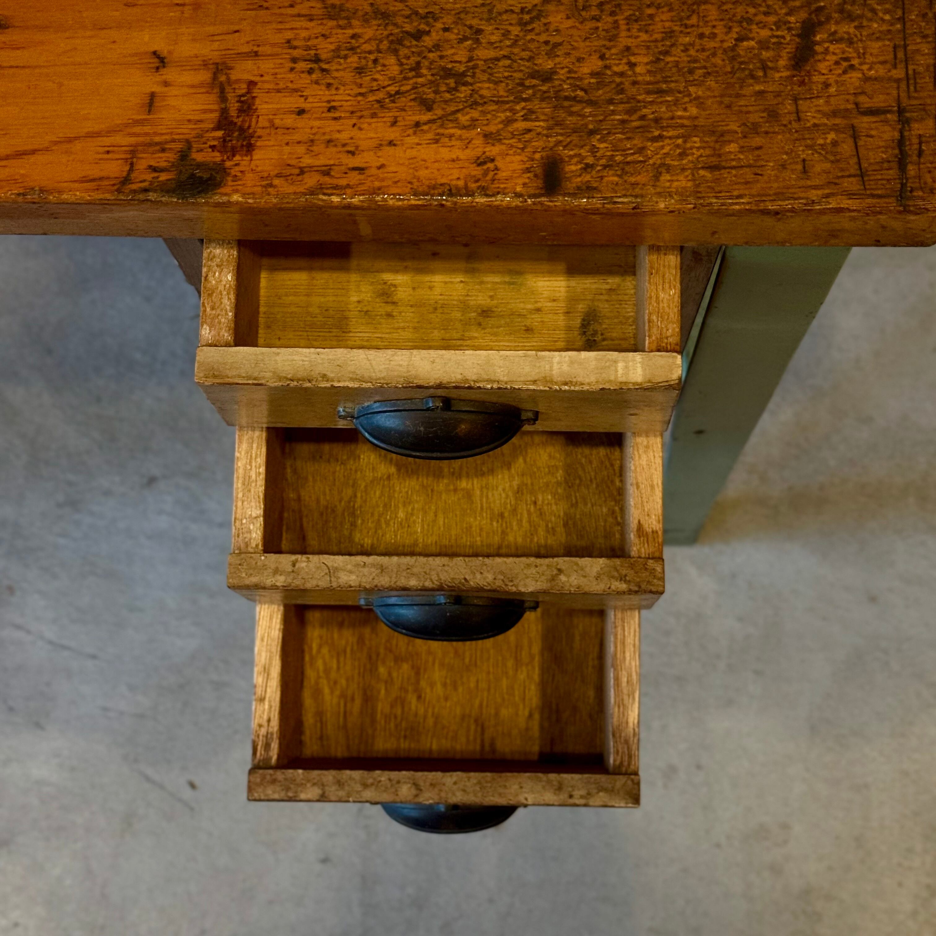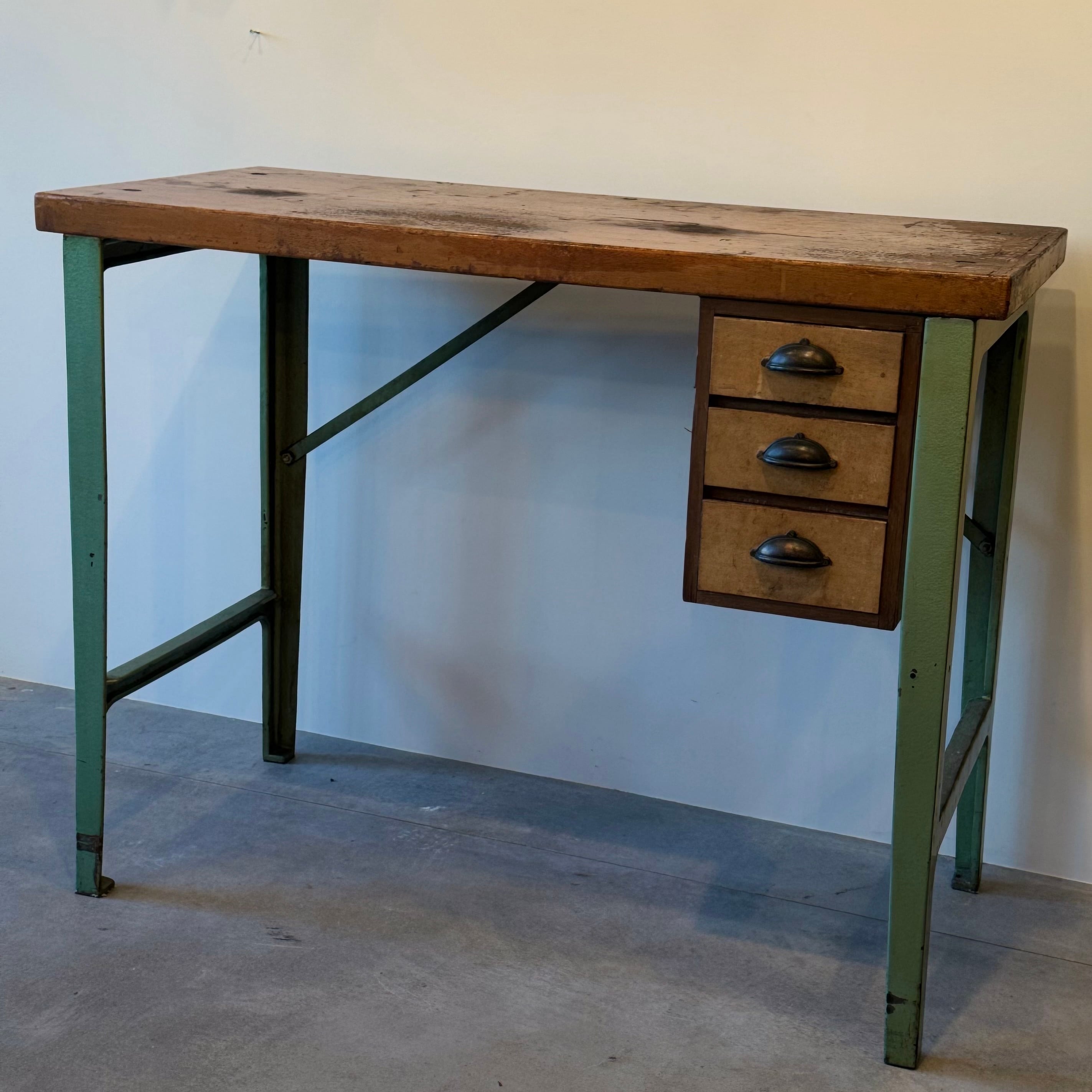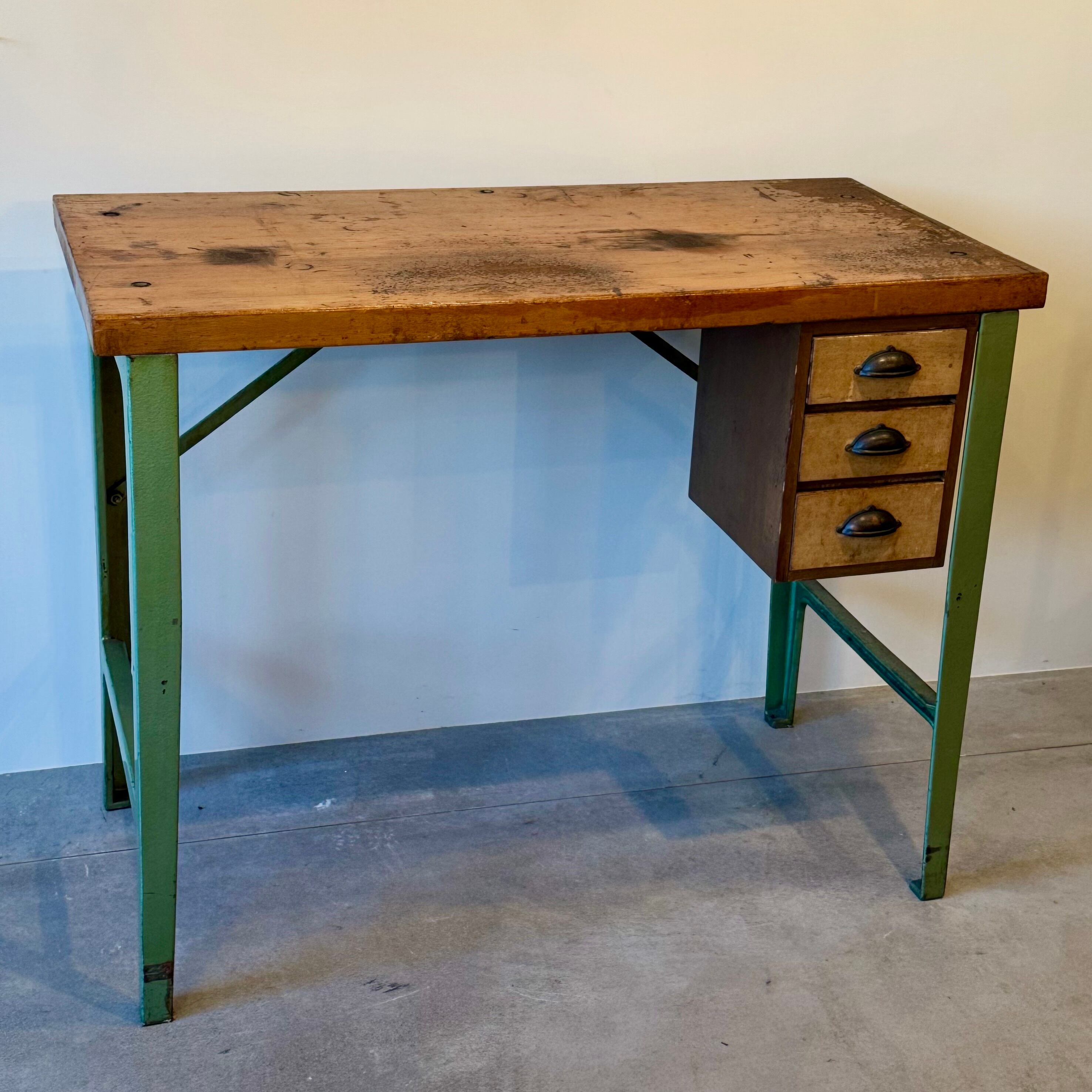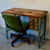 厚みのある木製天板に、グリーン塗装の金属脚を組み合わせた、工業系らしい無骨な佇まい。実際に作業台として使われてきたことが伺える、道具感のある一台です。