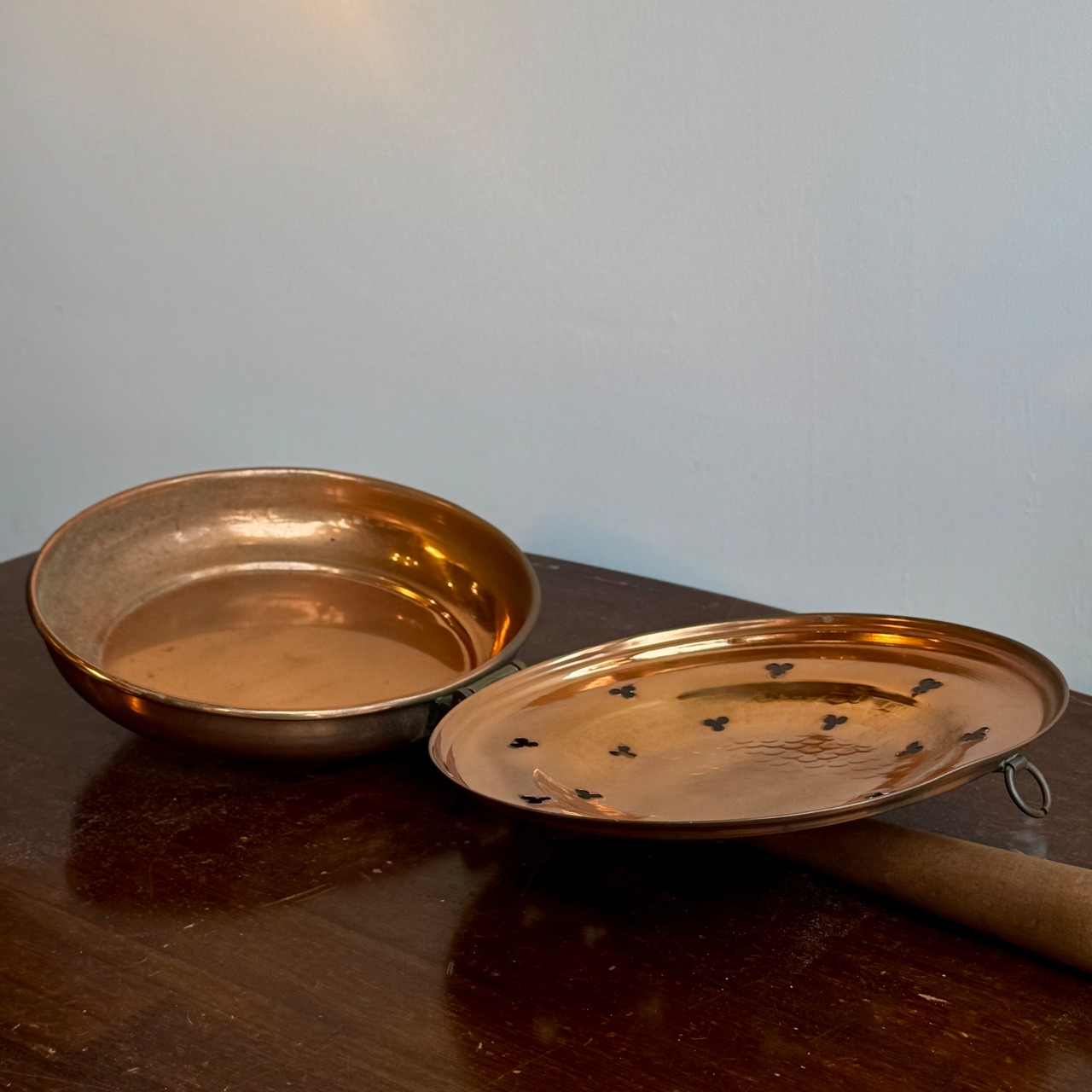 叩いて成形された銅の肌に残る、細かな槌目。