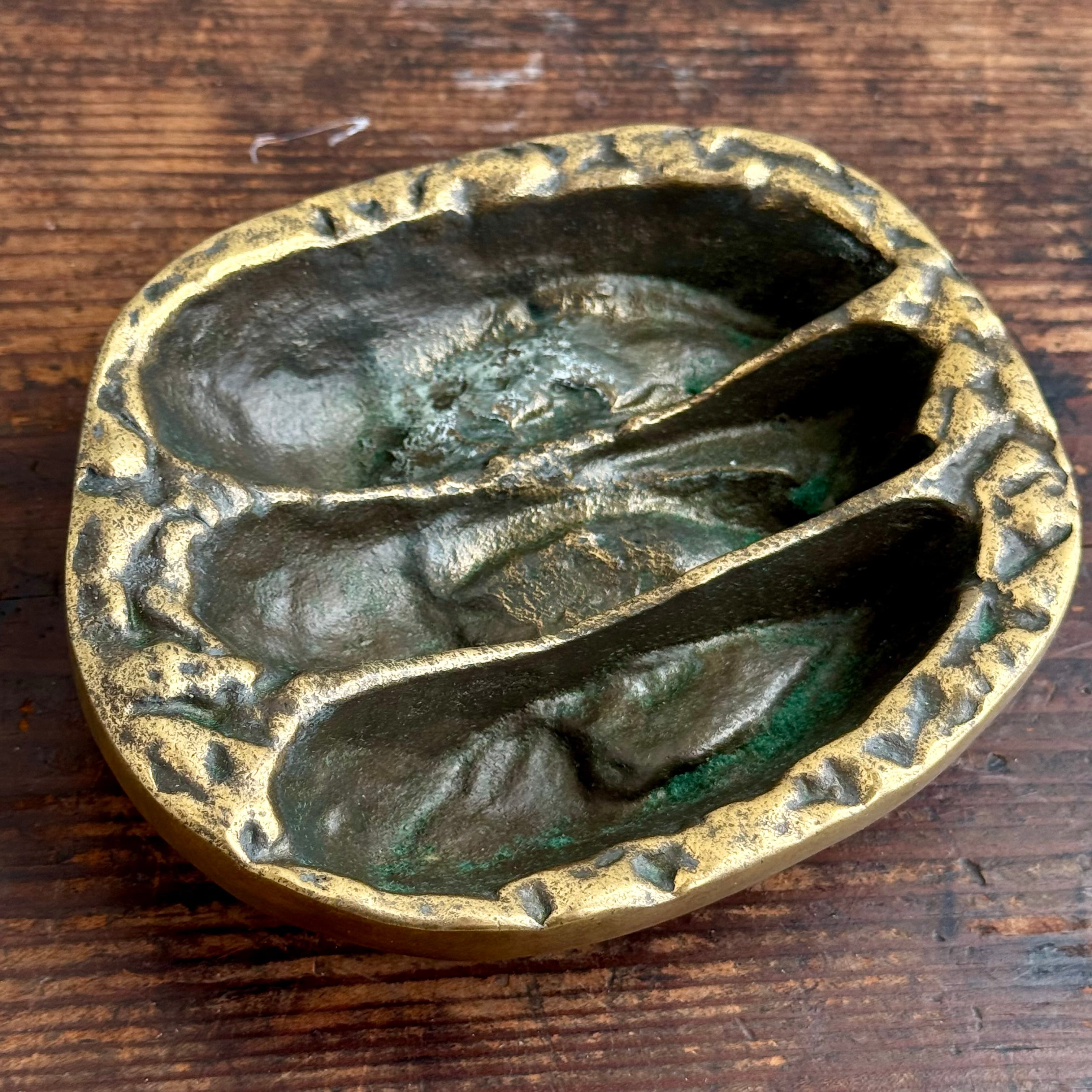 重厚感のあるブロンズ鋳造で、中央に仕切りのある実用的な造形。アクセサリートレイやデスク周りの小物置きとしても使いやすいサイズです。箱と冊子が揃って残っている点も希少です。