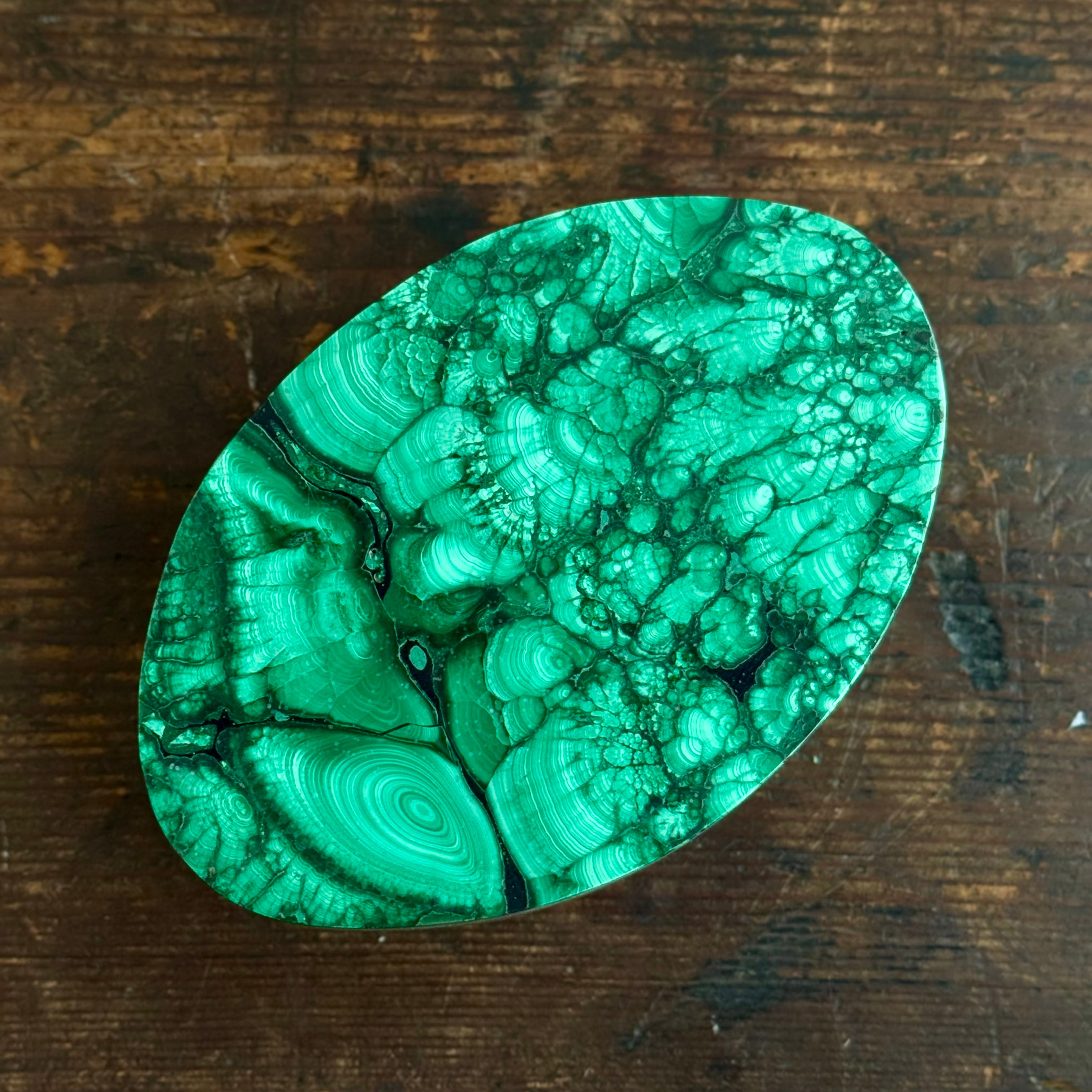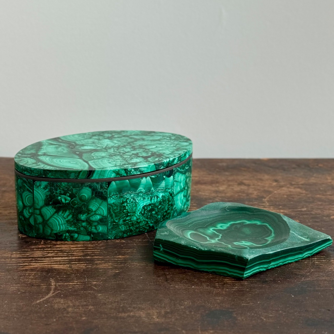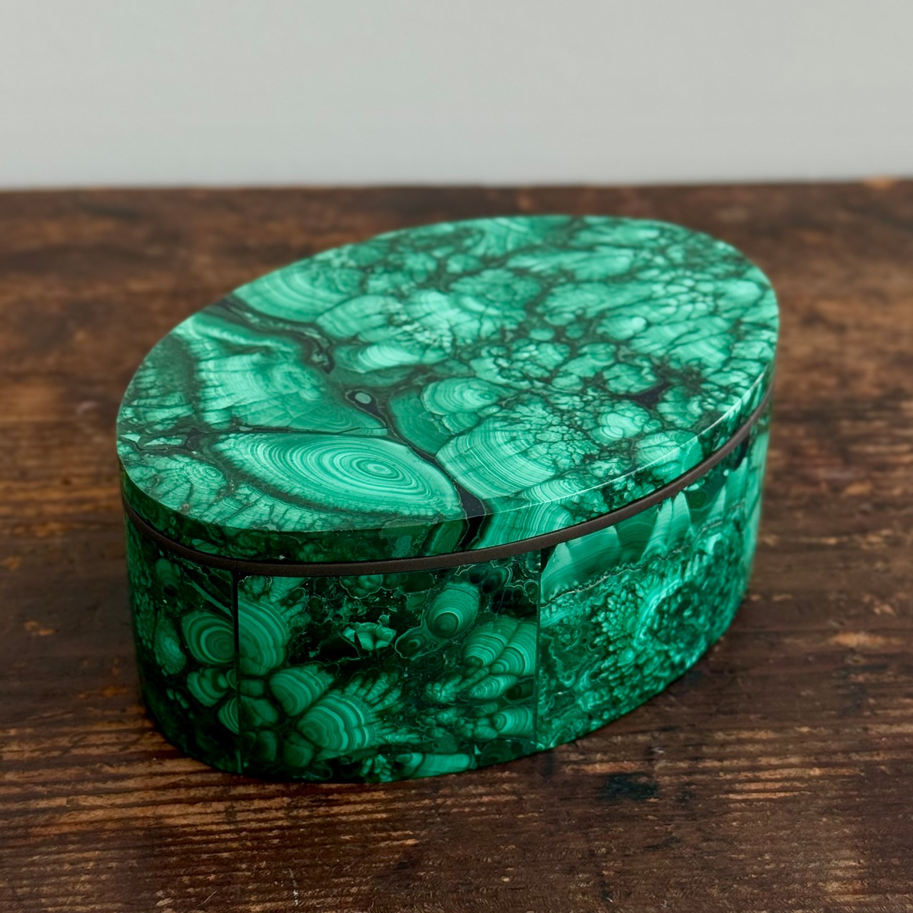 外装・内装ともにマラカイト特有の濃淡ある緑の文様が広がり、箱を開く動作そのものがひとつの体験になるような佇まい。