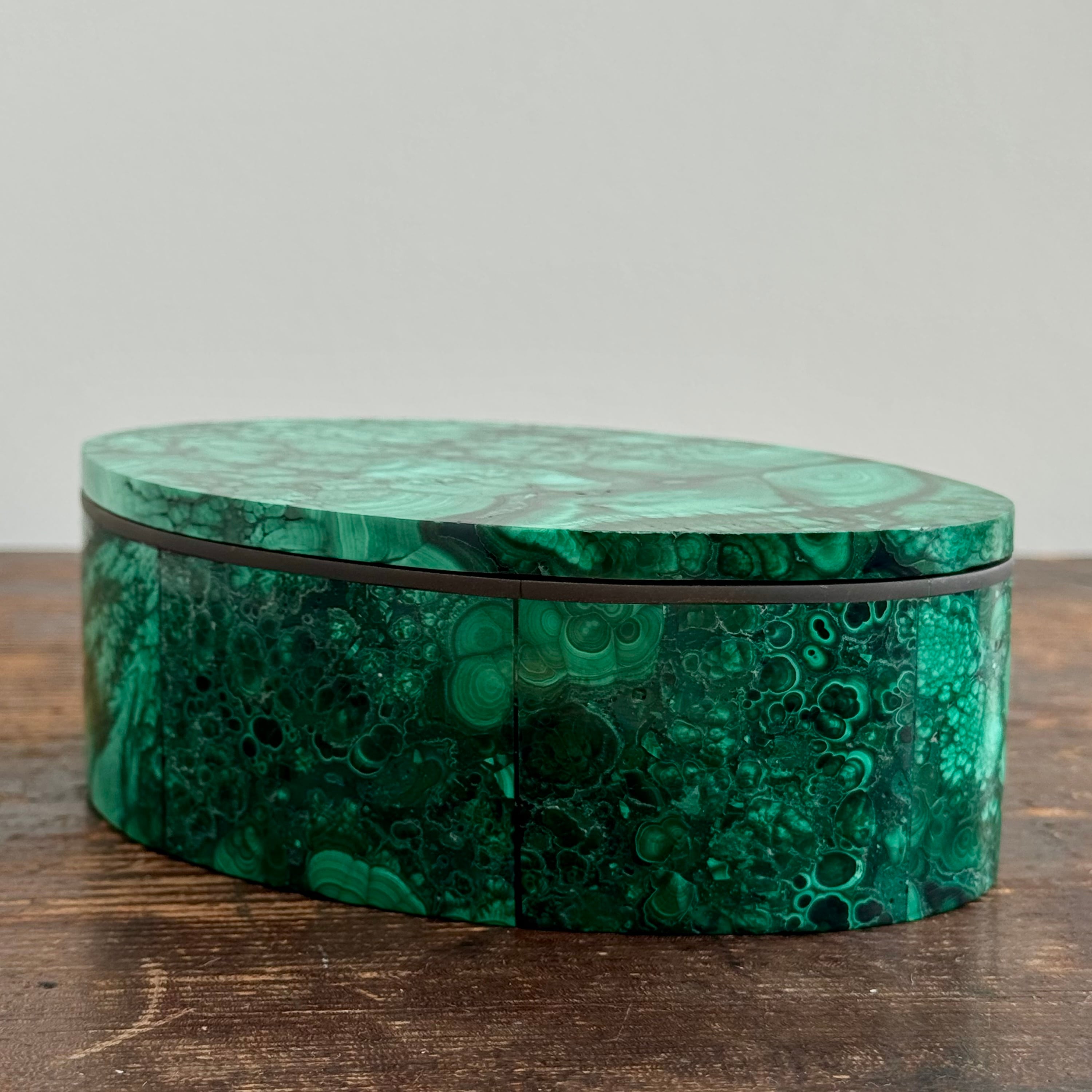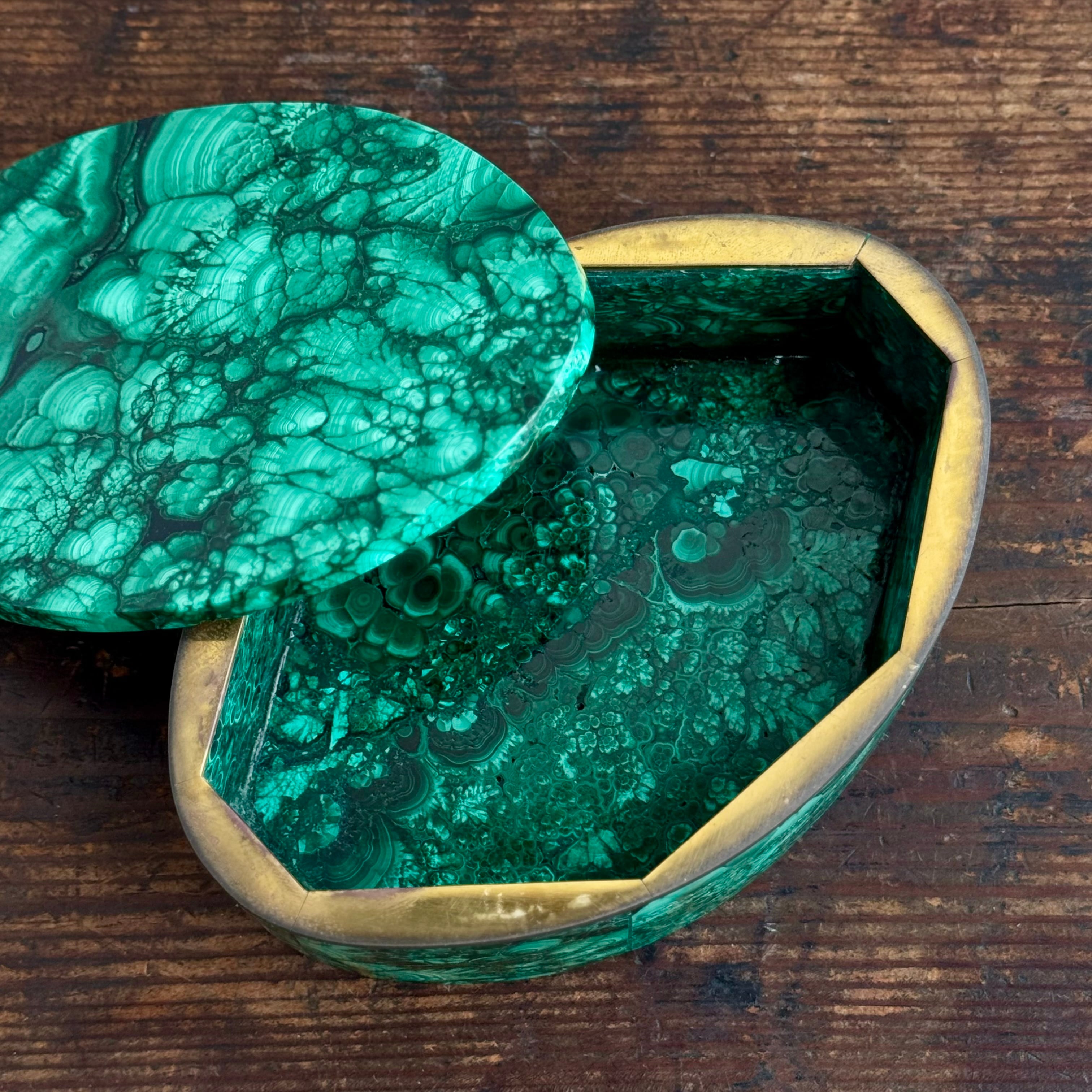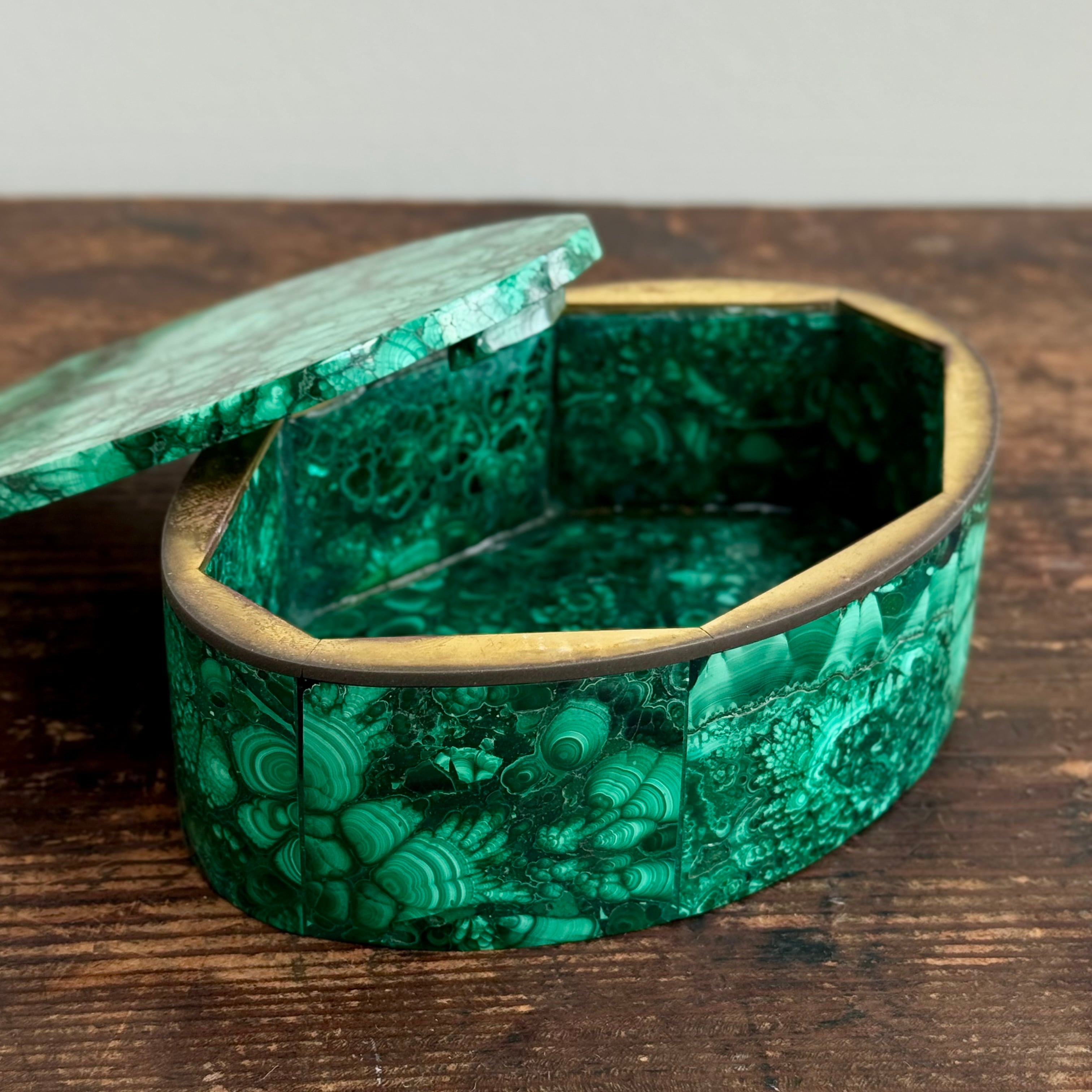 外装・内装ともにマラカイト特有の濃淡ある緑の文様が広がり、箱を開く動作そのものがひとつの体験になるような佇まい。
