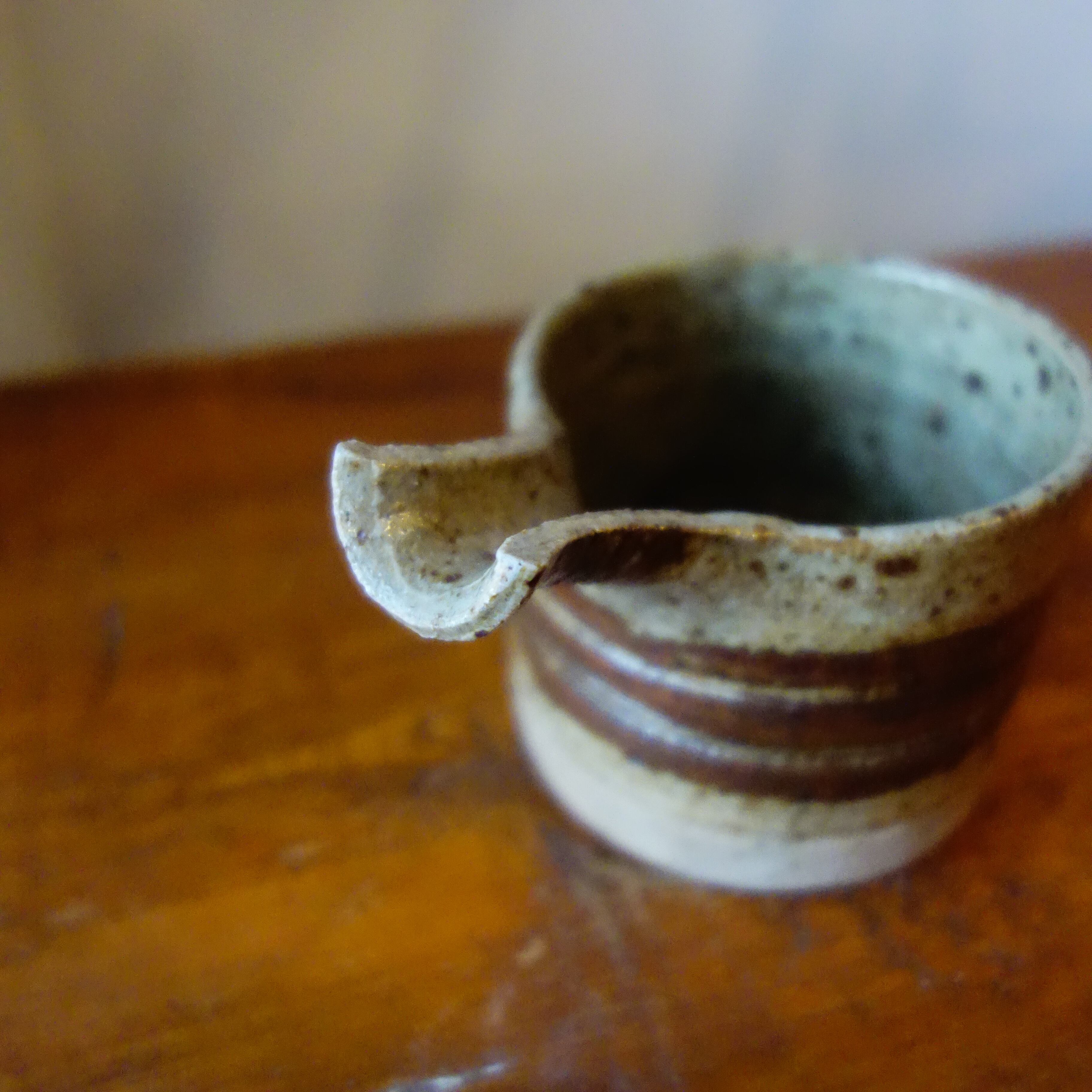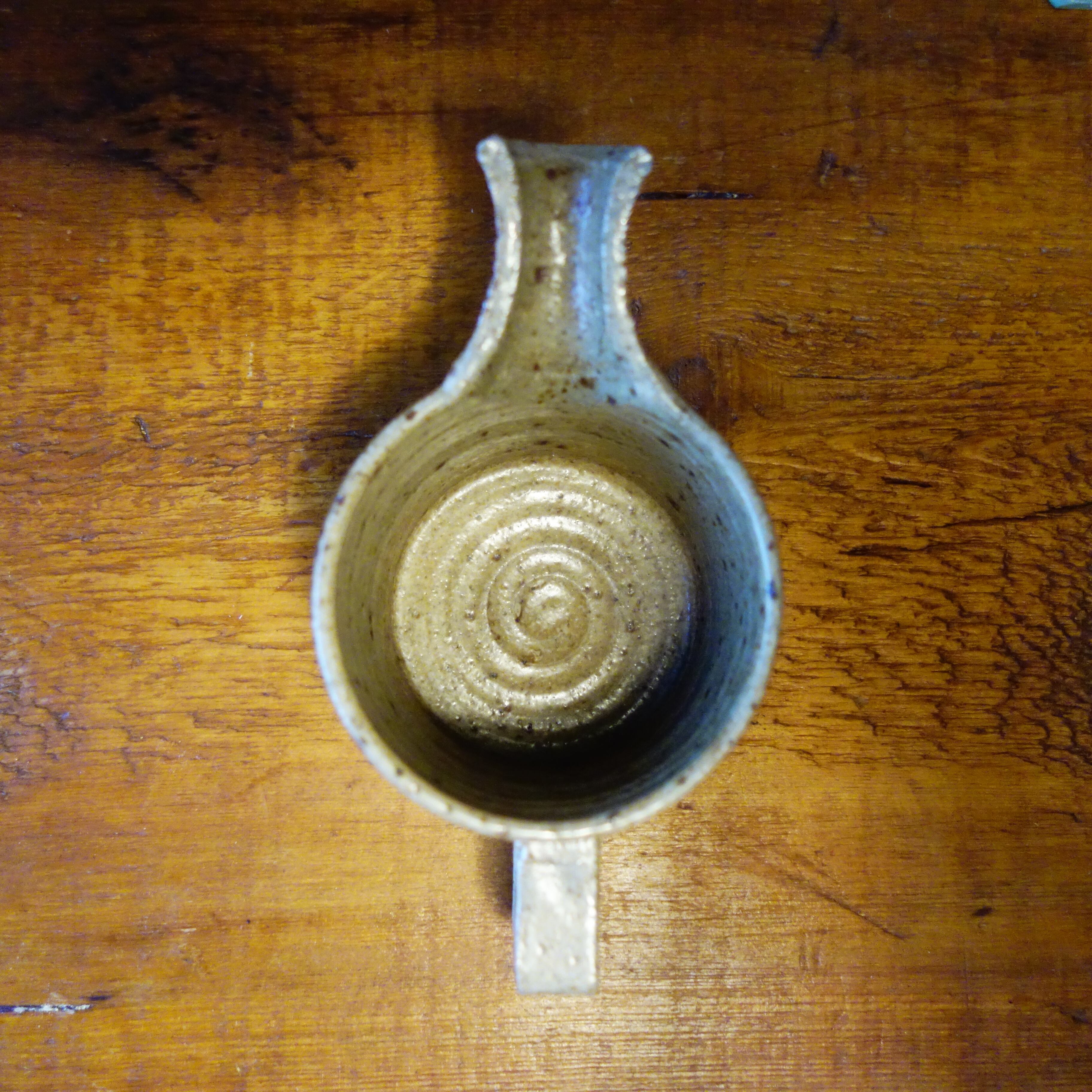 ざらりとした砂混じりの素地に、褐色の帯が水平に走る。轆轤の回転をそのまま残した内側の円環は、使うたびに時間の流れを指先でなぞるよう。片側に伸びる注ぎ口は、機能でありながらもどこか有機的で、意図と偶然のあわいに生まれたかたちです。
