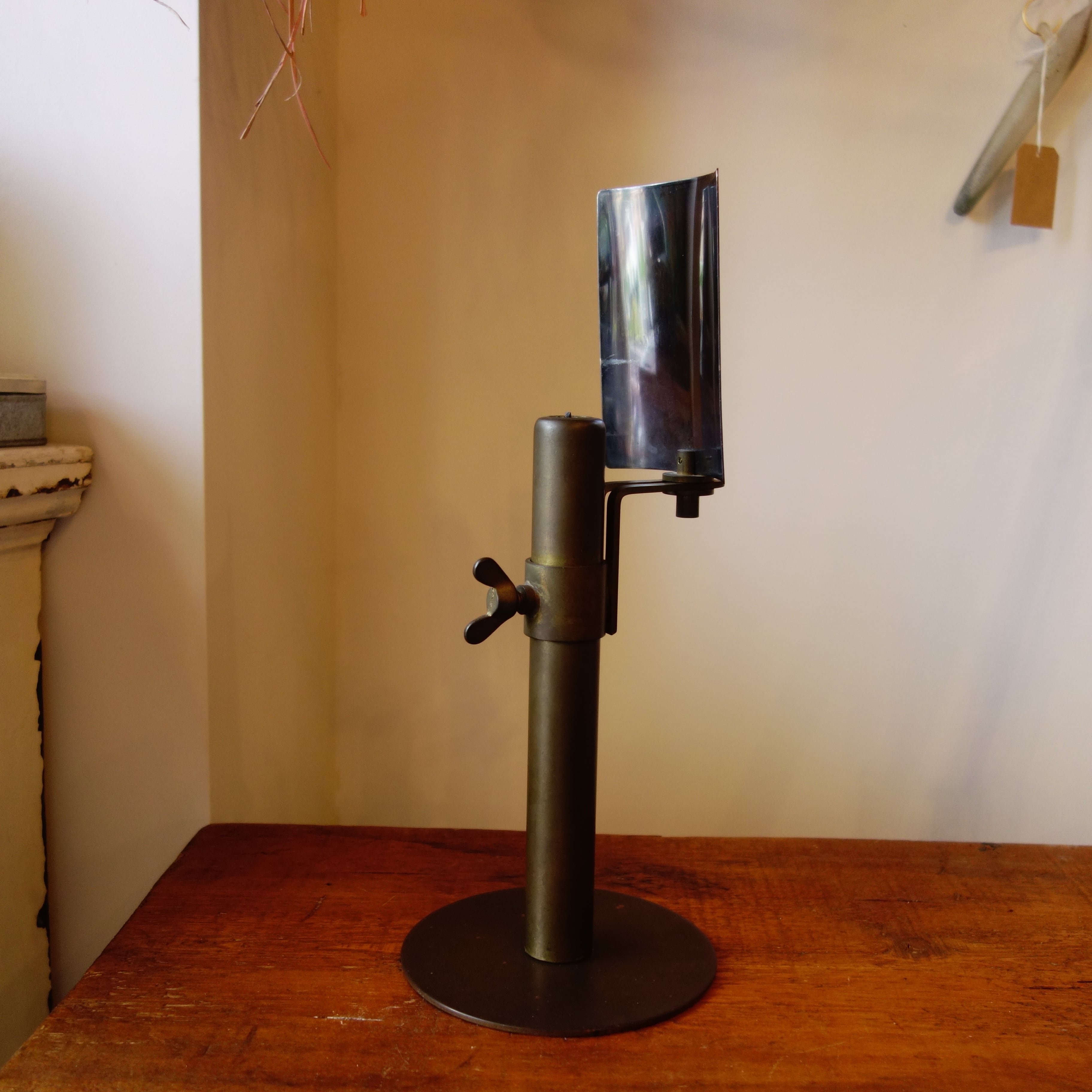 光を反射させるために設計されたシルバープレートのリフレクターがついており、光を反射し、風景を取り込みます。角度調整が可能で、キャンドルの火を前方に集め、空間に奥行きのある影を落とします。800個限定で製作されたうちの一つ(No.680)であり、デザイナーの意図が強く反映されたプロダクトです。