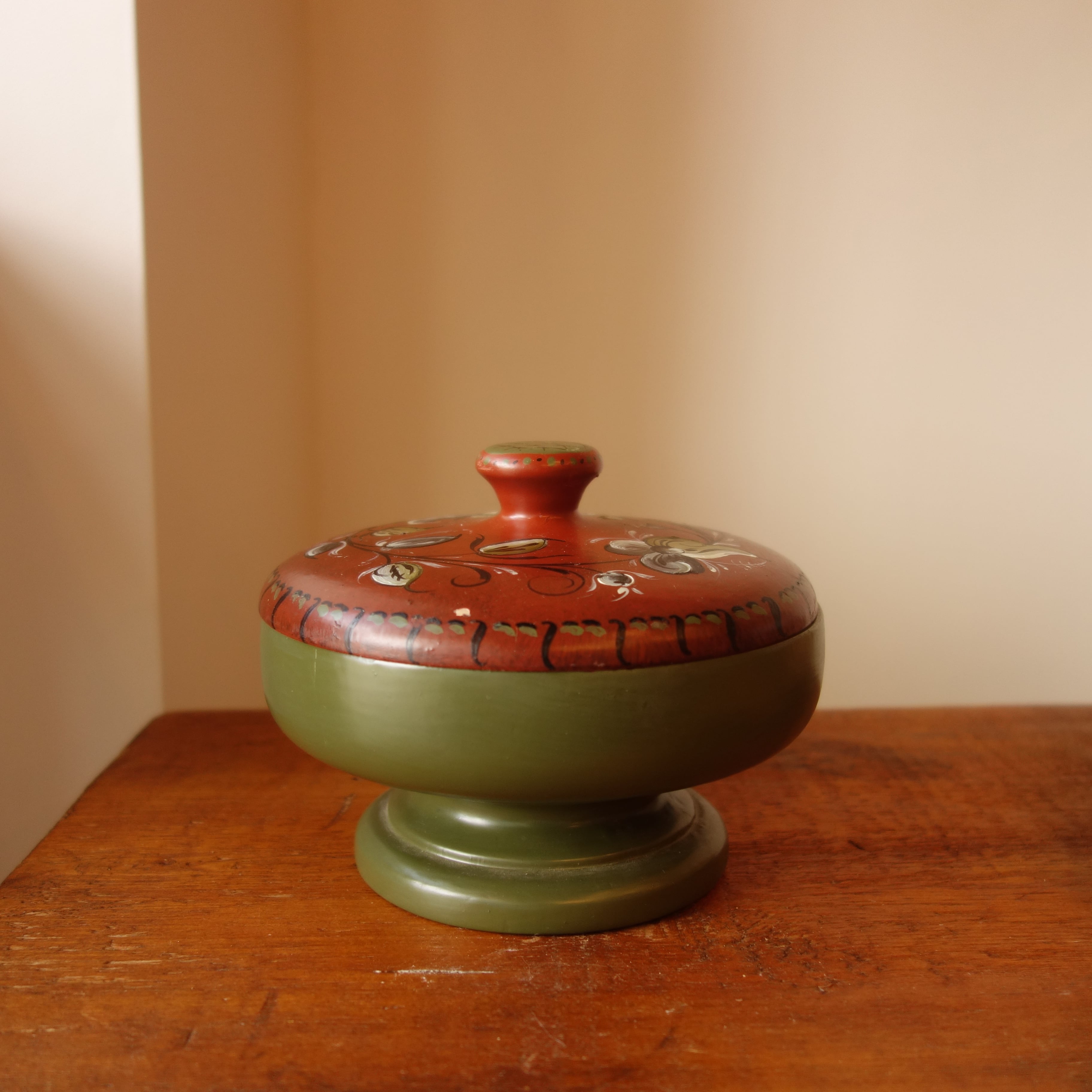 深いグリーンの器に、赤い蓋。