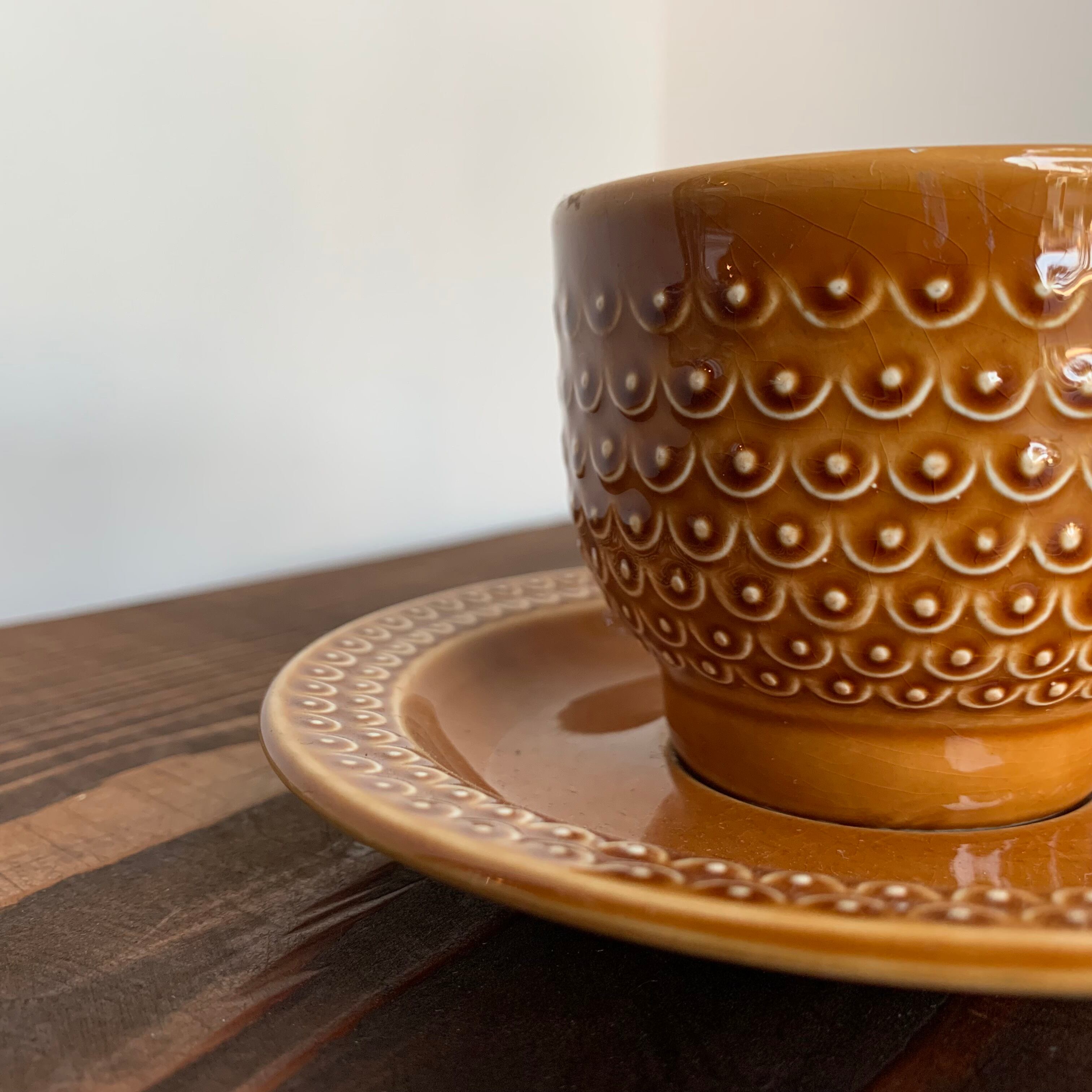 この商品、釉薬によって仕上げられたクラシックでモダンな色合いが良いですよね。また表面に隆起したドットと鱗の紋様が、一般的なカップでは得られない手触り感を生み出しています。