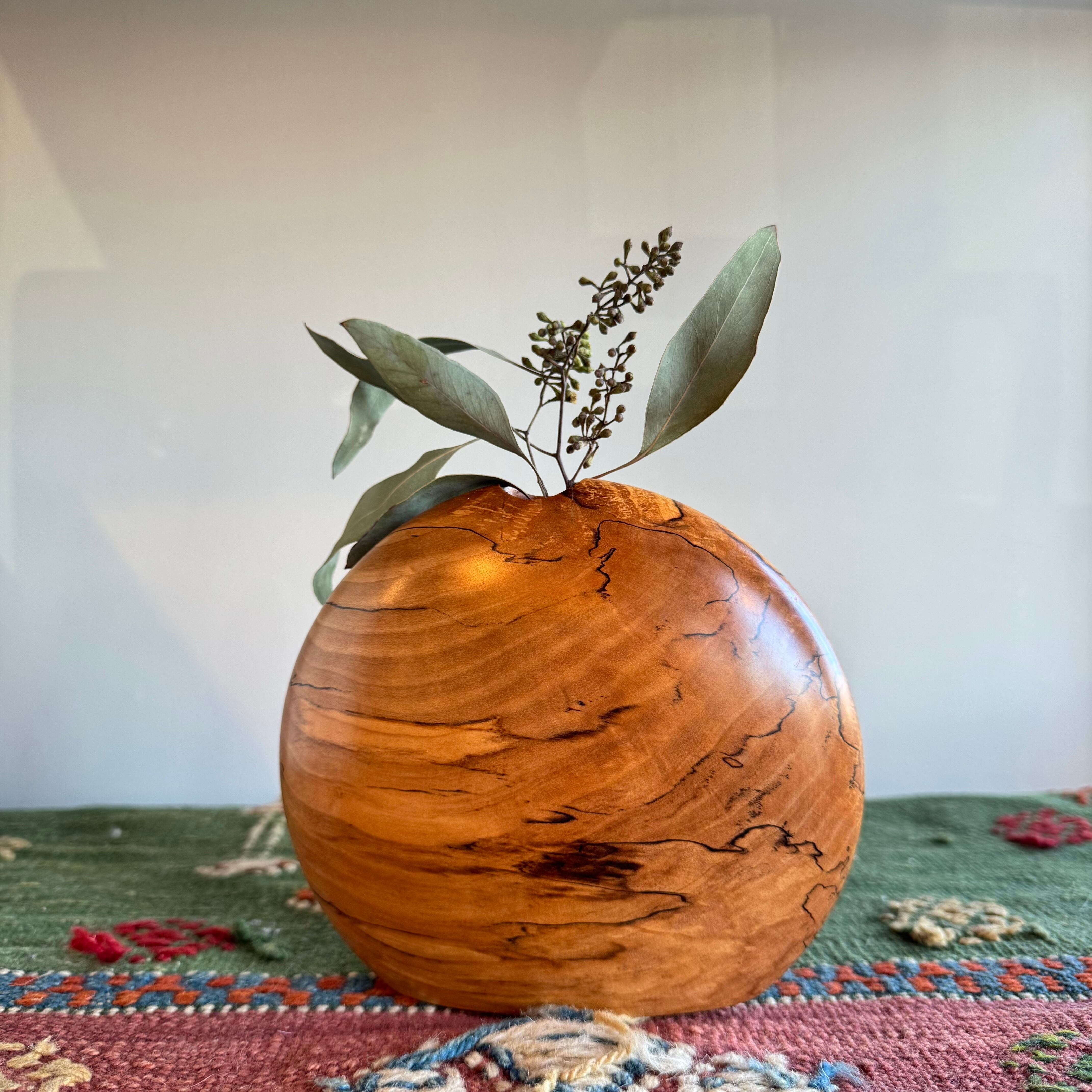 こちらは、木の温かみと木目模様が魅力の木製花瓶です。個性のある木目が個性を引き立たせ、小型サイズで棚やデスク上などの限られたスペースにも最適です。ドライフラワーやグリーンを挿すことで空間にアクセントを加えるほか、そのままオブジェとしても楽しめます。